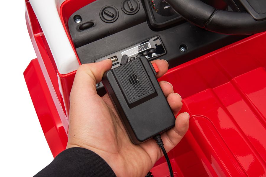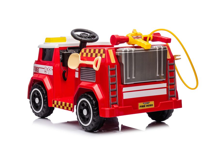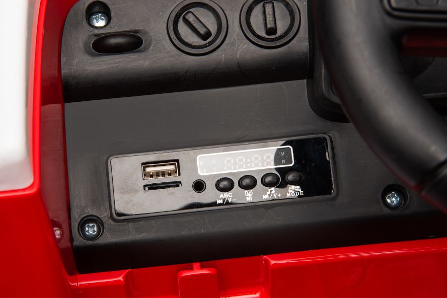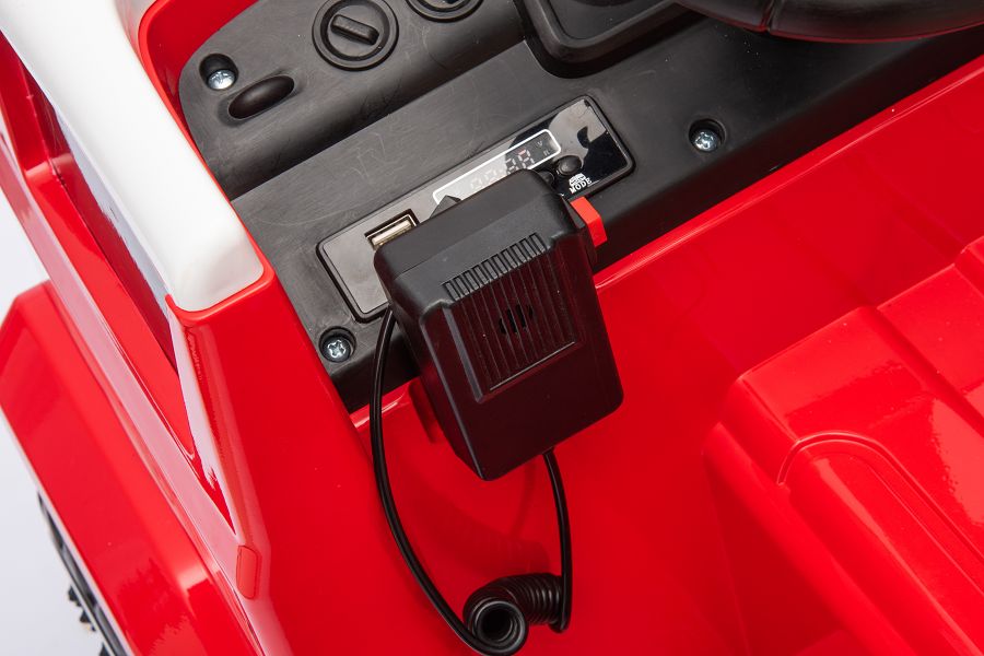 Das Elektroauto kann entweder per Pedal gesteuert oder über die 2,4 GHz-Fernbedienung gelenkt werden. Mit dem eingebauten Musiksystem, USB-, SD- und MP3-Anschluss sowie einem Intercom-System sorgt das Feuerwehrfahrzeug für Unterhaltung während der Fahrt.
