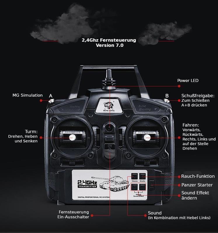 Fernbedienung: Vorwärts / Rückwärts normal und HIGH SPEED, Vorwärts Links- oder Rechtsdrehung, RückwärtsLinks- oder Rechtsdrehung , Kanone heben und senken, Geschützturm um 320Grad drehbar (160Grad rechts / 160Grad links), Munitionsabschuss auch während der Fahrt